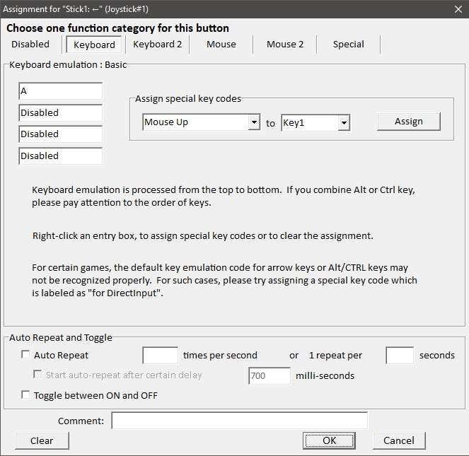 Esta es la configuración para el joystick izquierdo desplazado hacia la izquierda. En temblar , el botón «A» se mueve hacia la izquierda. Entonces escribimos » Y «en el primer cuadro de abajo emulación de teclado(emulación de teclado) . Si quisiéramos tener una combinación de botones, puede agregar hasta cuatro. Haga clic en Aceptar(Haga clic en Aceptar) para cerrar esta ventana.