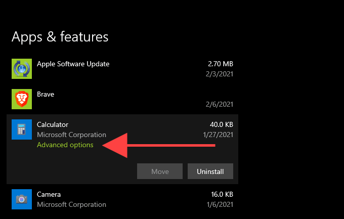 3. Seleccione Calculadora de Windows(Windows Calculator) . Luego, selecciona Opciones Avanzadas(Advanced Options) .
