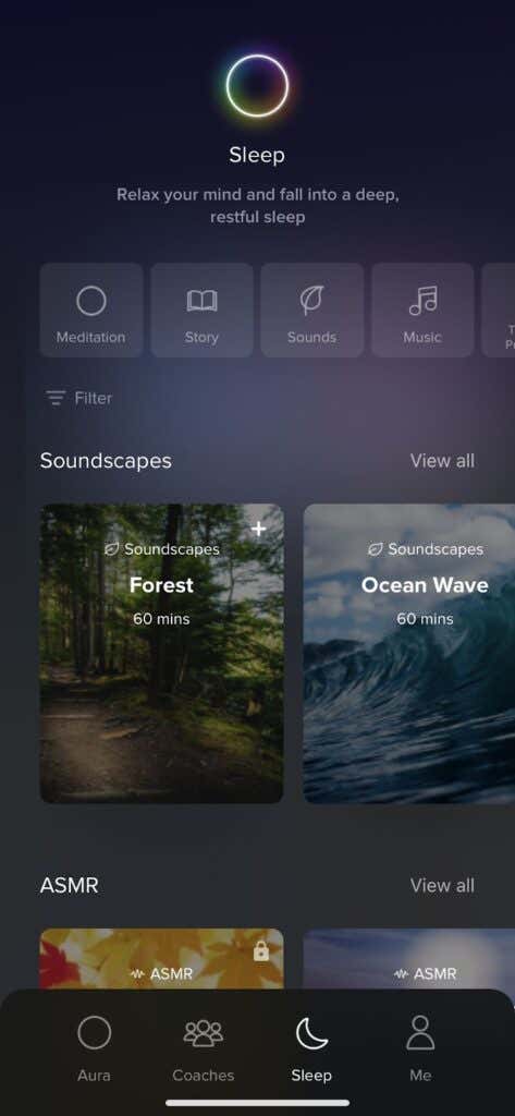 La gran parte de la aplicación Aura(Aura app) es que hay tantos tipos diferentes de meditaciones para elegir, sin importar lo que quieras obtener de la práctica. Para dormir, puedes encontrar paisajes sonoros, ASMR , meditación de sueño(sleep meditation) profundo , historias, escaneos corporales e incluso algo de yoga.