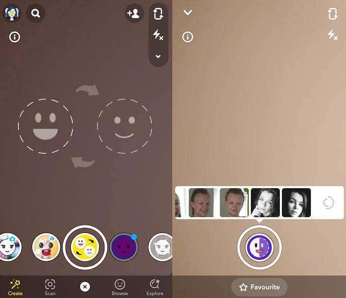 Snapchat también tiene una opción para intercambiar caras con alguien de tu galería de imágenes. Al seleccionar la lente, elija el ícono de cambio de cara púrpura(purple face swap icon) con una carita sonriente. También puede crear un video deepfake de usted mismo usando la función Cameos de Snapchat(Snapchat’s Cameos feature) .