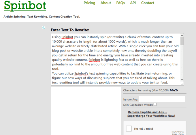 Spinbot es una herramienta de paráfrasis gratuita que gira el contenido que pegas o escribes directamente en su editor.