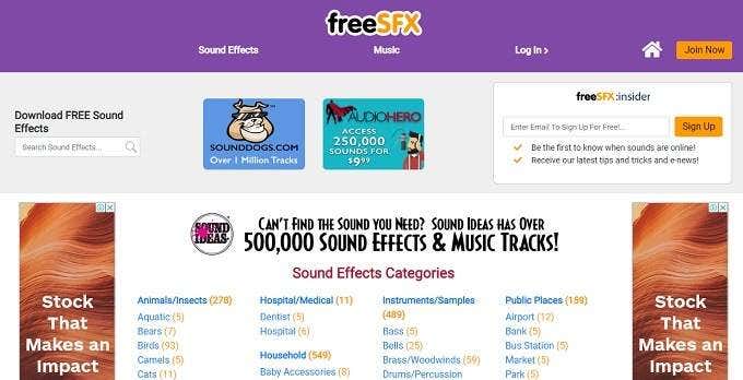 A pesar de tener un sitio web que parece provenir de mediados de los 90, freeSFX en realidad está diseñado de tal manera que encontrará la categoría de efecto de sonido que necesita muy rápidamente. Lamentablemente, incluso si encuentra el sonido que desea rápidamente, deberá registrar una cuenta antes de poder descargar cualquier cosa.