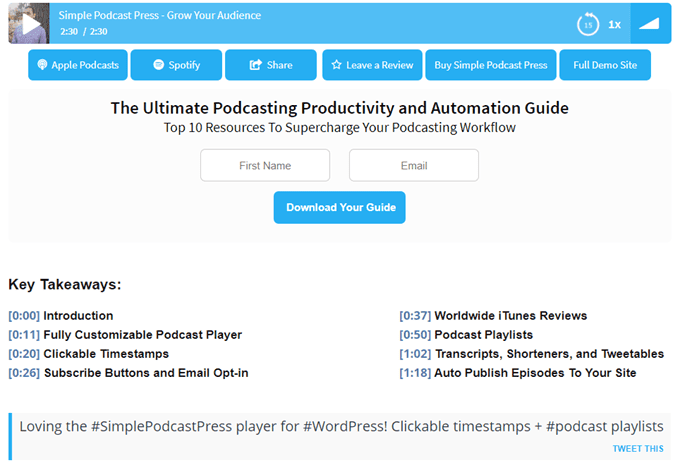 El complemento SimplePodcastPress proporciona las herramientas para publicar su podcast en su sitio de WordPress . Proporciona a su sitio un reproductor compatible con dispositivos móviles fácil de usar(mobile-friendly) . También puede integrar marcas de tiempo en las que se puede hacer clic para que sus oyentes puedan regresar y escuchar los puntos clave una y otra vez.