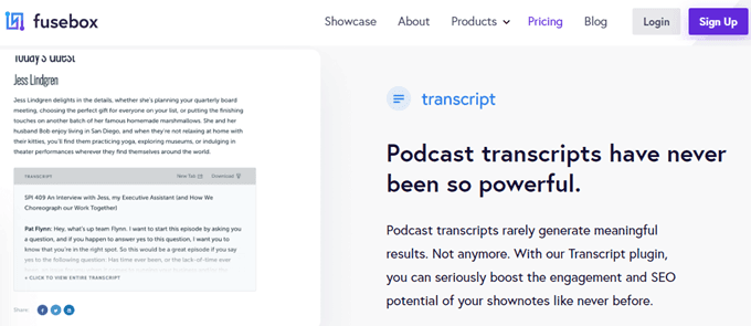 Fusebox es una caja de herramientas llena de extras para podcasting. Descubrirá que tiene muchas de las mismas características que los otros complementos del administrador de podcasts de los que estamos hablando. Donde realmente brilla como complemento de Podcast de WordPress(WordPress Podcast) es que proporciona una transcripción, incluso en la versión gratuita.