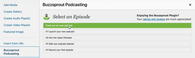 El complemento Buzzsprout Podcast(Buzzsprout Podcast Plugin) para WordPress simplifica compartir sus podcasts alojados Buzzsprout dentro de su sitio web. Crea un nuevo ícono en su barra de herramientas Upload/Insert para acceder con un solo clic a todas sus capacidades.