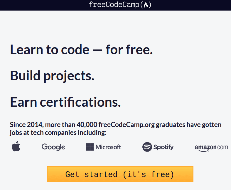 Como sugiere su nombre, freeCodeCamp es una plataforma de aprendizaje con cursos de programación gratuitos. Si recién está comenzando y aún no está seguro de en qué lenguajes de codificación enfocarse, freeCodeCamp es un buen comienzo.