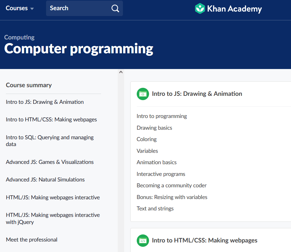 Khan Academy es ideal si recién estás comenzando. Nunca ha sido tan fácil aprender los conceptos básicos de programación informática en cualquier idioma y es gratis. Y lo mejor de todo es que ni siquiera necesita registrarse para obtener una cuenta. Empiezas a aprender a programar de inmediato.