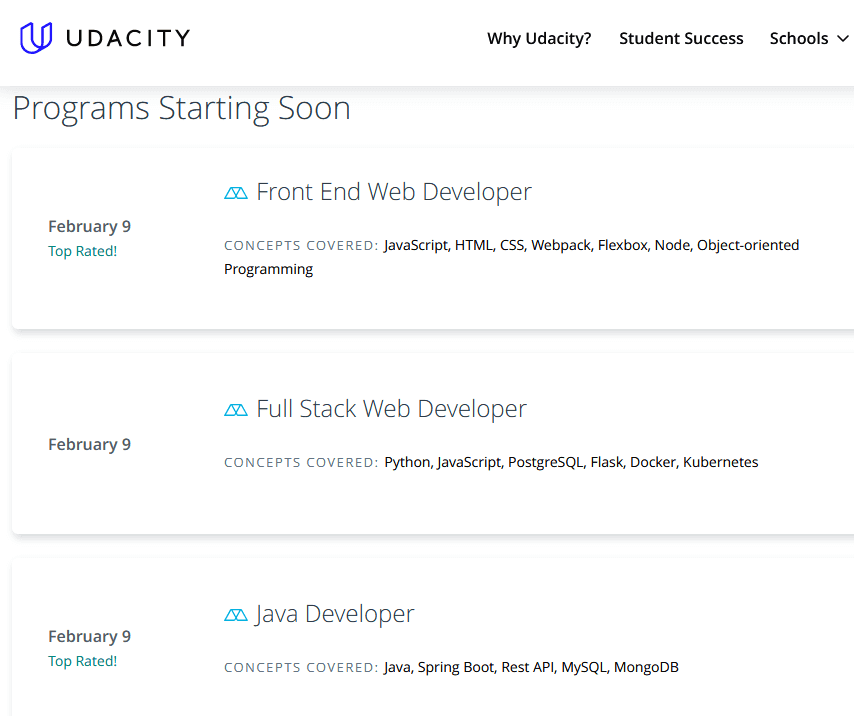 Udacity ofrece una gran colección de cursos de programación basados en tus intereses. Hay múltiples «escuelas» para elegir, como la escuela de programación y desarrollo y la escuela de ciberseguridad. Cada escuela viene con un conjunto de programas que cubren todos los conceptos que necesitas para dominar un tema determinado.