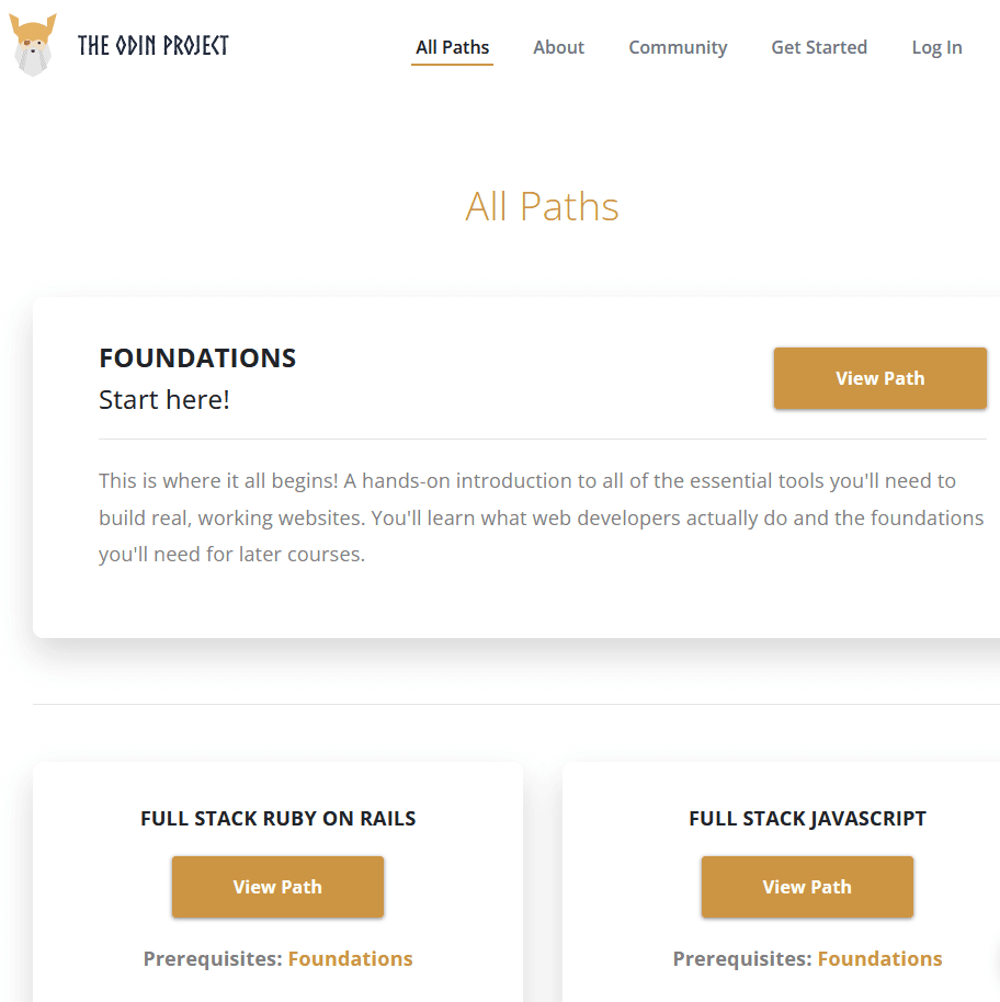 El Proyecto Odin(Odin Project) le ofrece dos caminos principales: el plan de estudios de Ruby on Rails y el plan de estudios de (Rails)JavaScript de pila completa . Si bien sus opciones parecen limitadas, en realidad no lo son. Por ejemplo, el plan de estudios de Ruby on Rails le enseñará HTML , CSS , SQL y JavaScript junto con la programación de Ruby . Obtienes mucho valor gratis.