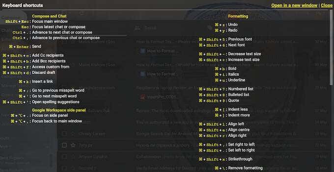 Afortunadamente, hay un atajo de teclado maestro que puedes usar para abrir la lista con todos los atajos de teclado en Gmail . ¿Es Mayús(Shift ) + ? . Esto abrirá una hoja de trucos en la parte superior de su página de Gmail con todos los accesos directos.