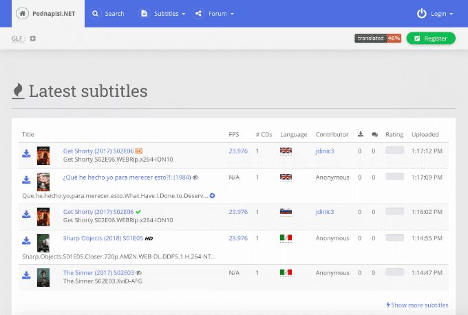Podnapisi está separado en secciones claras, con la página principal que muestra una lista de los últimos subtítulos subidos, así como secciones que muestran las subidas recientemente mejor calificadas, más descargadas y más comentadas.