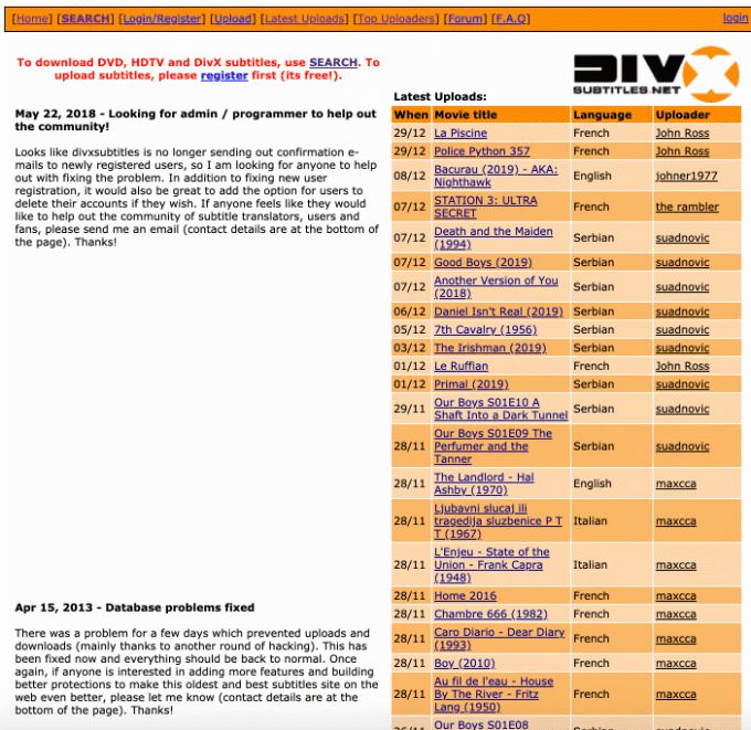 Si bien el sitio se ve y suena como algo de principios de la década de 2000, DIVX Subtitles sigue siendo un recurso útil para encontrar subtítulos para descargar, especialmente para versiones anteriores. El sitio ha estado en funcionamiento desde al menos 2002 (y antes de eso por un propietario diferente).