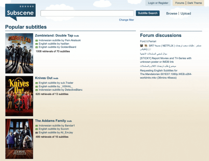 Subscene existe desde alrededor de 2005 y ofrece subtítulos en varios idiomas, incluidos aquellos especialmente diseñados para personas con discapacidad auditiva. La interfaz es simple, con una barra de búsqueda prominente en la parte superior y películas populares y publicaciones en foros enumeradas en la página principal.