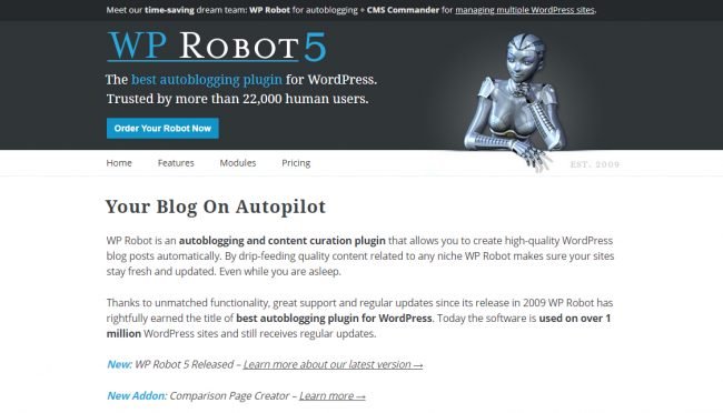 WP Robot es un complemento único de blogs automáticos para WordPress que lo ayudará a agregar contenido curado de alta calidad a su sitio web en minutos.