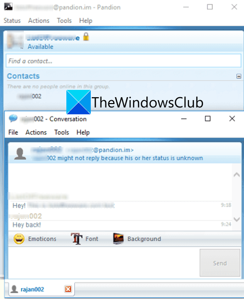 Pruebe Pandion(Try Pandion) , que es un cliente XMPP sencillo y gratuito para Windows 11/10 . Puede crear una nueva cuenta o usar la existente para comenzar a enviar mensajes a sus amigos dentro de la red XMPP . Le permite personalizar su nombre de perfil, dirección, avatar y estado.