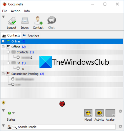 Coccinella es un software de cliente XMPP gratuito de código abierto para (XMPP)Windows 11/10 , Mac y Linux . Es un buen software para mensajería instantánea privada dentro de la red XMPP . Simplemente puede descargar e instalar este software y luego comenzar a chatear en Windows 11/10 . Le permite iniciar sesión con su cuenta registrada, o también puede crear una nueva.