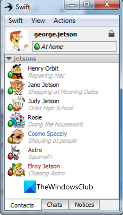 Swift XMPP Client es otro cliente XMPP gratuito y de código abierto para(XMPP) Windows Windows 11/10 . Puede usarlo para chatear dentro de la red XMPP . Es un software compacto y facilita la mensajería segura en Windows 11/10 . Puede crear salas de chat y luego comenzar a enviar mensajes a varias personas. Puede encontrar pestañas dedicadas para sus Contactos, Chats y Avisos.