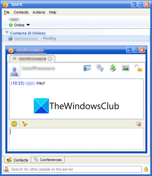 Spark es otra opción para un cliente XMLL gratuito de código abierto para (XMLL)Windows 11/10 . Es un buen software para enviar mensajes individualmente o en grupos. Al usarlo, puede chatear con texto sin formato, emojis, etc. Incluso puede compartir capturas de pantalla y archivos en sus chats. Utiliza un fuerte cifrado de chat para mantener tus mensajes privados y seguros.