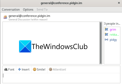 Otro cliente XMPP gratuito y de código abierto para Windows 11/10 es Pidgin . A través de él, puede agregar y administrar varias cuentas XMPP a la vez. (XMPP)Simplemente puede agregar un contacto y luego comenzar a enviarle mensajes. Te permite enviar texto sin formato, texto con fon personalizado, enlaces y emoticonos. además de chatear individualmente, también puedes crear un chat grupal. Además, te permite exportar tus chats en formato HTML . También puede consultar los registros de chat, bloquear a un usuario, etc.