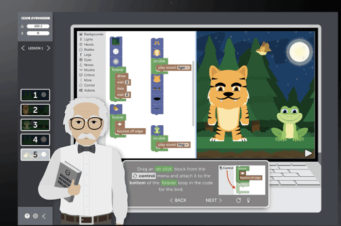 Las lecciones comienzan con conceptos como sintaxis, métodos, bucles y variables. El juego presenta gráficos divertidos para ayudar a los niños a aprender a codificar.