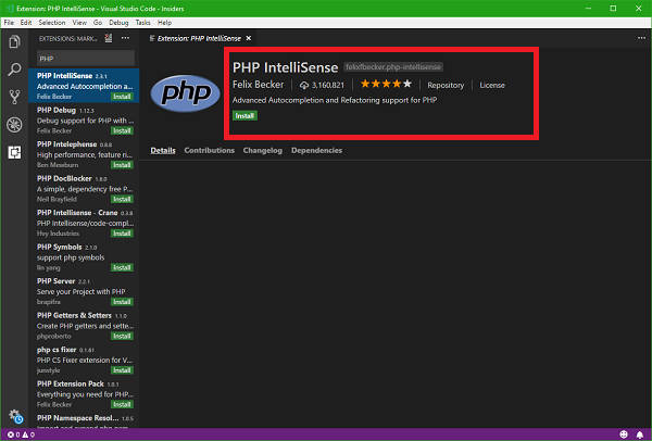 Instalar el código de Visual Studio(Instalar código de Visual Studio) luego busque o descargue la extensión para PHP como se indica en los pasos anteriores o siga este enlace mercado.visualstudio.com .