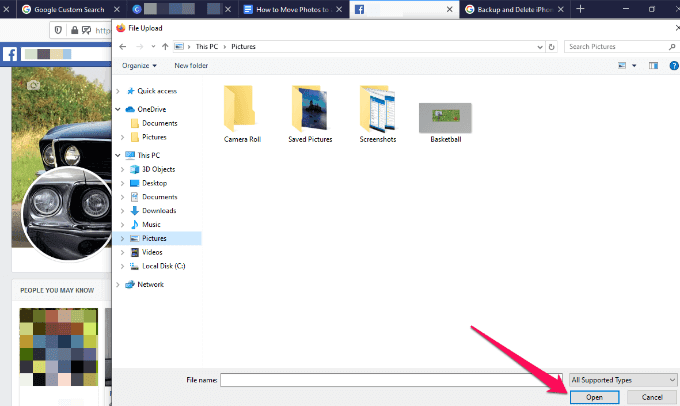 - Elija las fotos o los videos que desea agregar a su álbum y luego haga clic en Abrir(Open) .