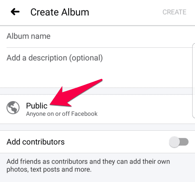 - Si desea que su álbum tenga acceso restringido o esté disponible para el público, toque para elegir la configuración de privacidad y luego toque Crear(Create) .