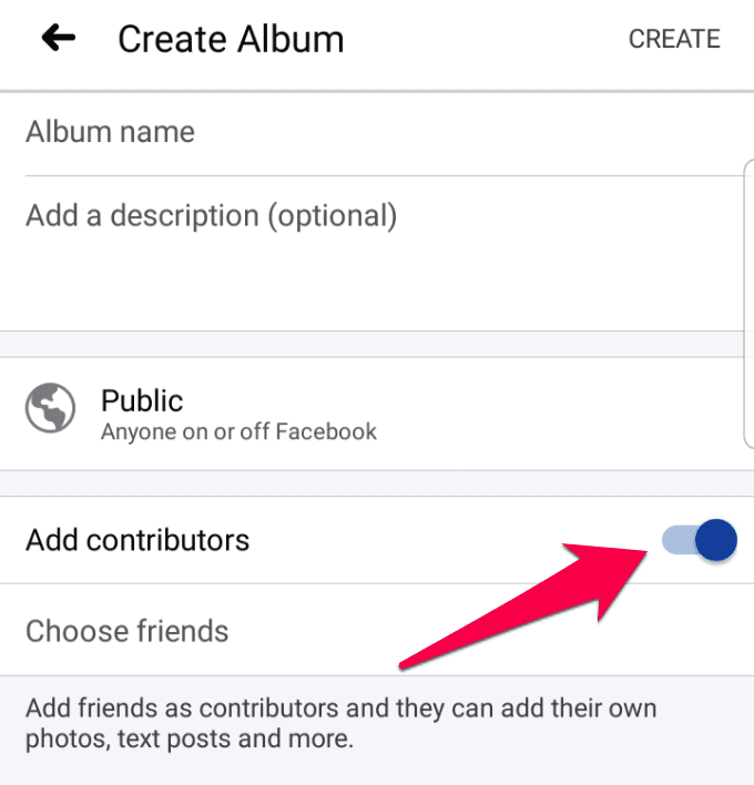 - Si desea que otros contribuyan a su álbum, cambie el interruptor de Colaboradores(Contributors) y elija los nombres de su lista de Amigos(names from your Friends list) . Presiona Listo(Done) .