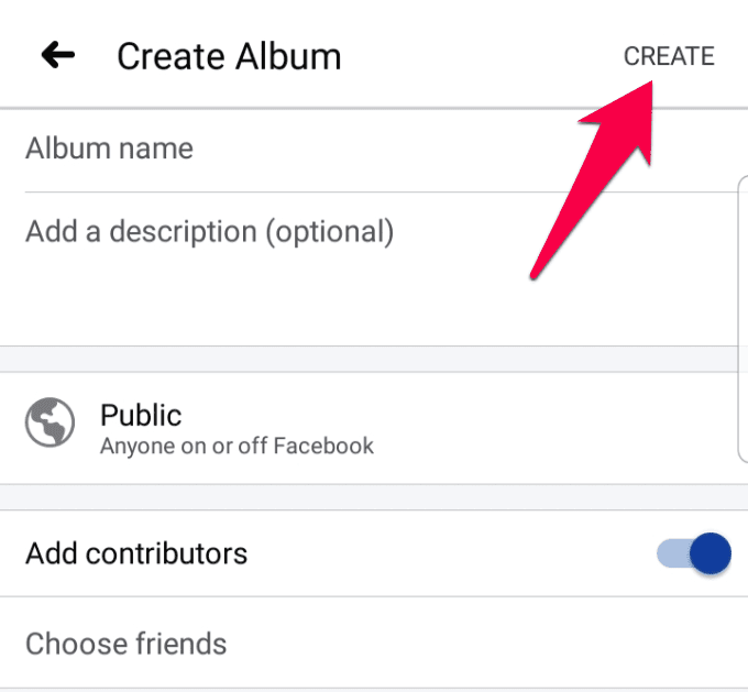 - Dale al álbum un título, una descripción o una ubicación. También puede etiquetar a sus amigos o familiares, agregar colaboradores(contributors) y elegir quién puede ver las fotos en el álbum. Por ejemplo, puede elegir Amigos, Público,(Friends, Public ) etc.