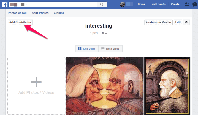- Para crear un álbum compartido, vaya a un álbum y, en la parte superior izquierda, busque y haga clic en Agregar colaborador.(Add Contributor.)