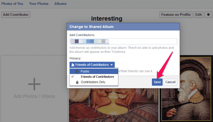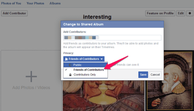 - Escriba los nombres de los colaboradores que desea agregar al álbum y luego elija una audiencia( choose an audience) . La audiencia puede ser solo contribuyentes del álbum(Album) , amigos de los contribuyentes del álbum(Album) o públicos(Public) .