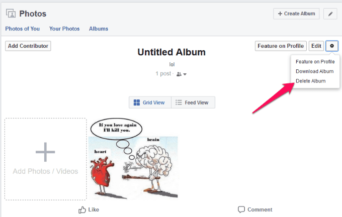 - Haga clic(Click) en el ícono de ajustes en el lado superior derecho y luego haga clic en Eliminar álbum(Delete Album) .