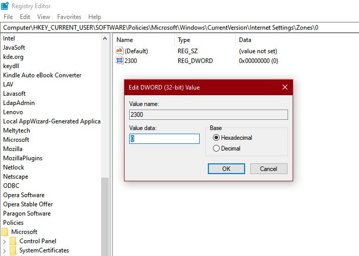 haga doble clic 2300 y establecer datos de valor (Datos de valor) en 0 (para habilitar la política) o 1 (elegir Tarea(insinuación) ). De esta manera, habilita la política con editor de registro(Editor de registro) .