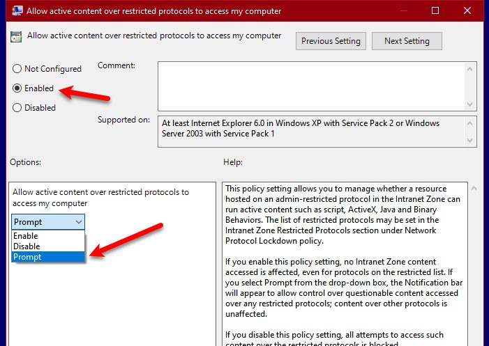 Ahora haga doble clic en la política » Permitir protocolos de contenido activo restringido para acceder a mi(Permitir protocolos de contenido activo restringido para acceder a mi) equipo» y seleccione Activado (Activado) para habilitar la política.