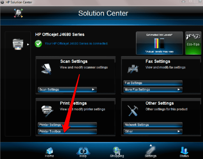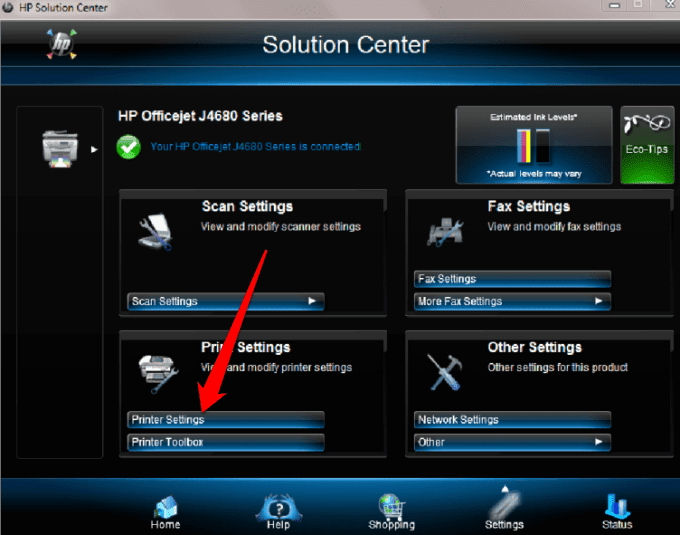 - Encienda su impresora, cargue papel y vaya al Centro de soluciones de HP(HP Solution Center) . Seleccione Configuración(Settings ) > Configuración de impresión( Print Settings) .