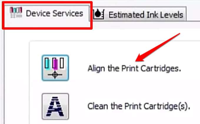 En la ventana Caja de herramientas de la impresora , seleccione (Printer Toolbox)Alinear(Align) los cartuchos de impresión en Servicios del dispositivo(Device Services) y luego seleccione Alinear(Align) . Siga las instrucciones en pantalla para completar el proceso.