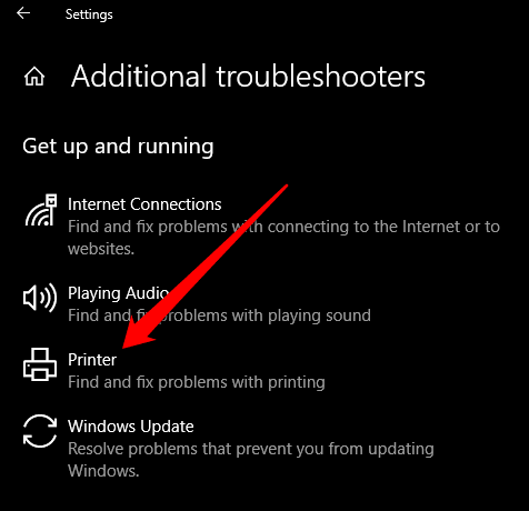 - Seleccione Solución(Troubleshoot) de problemas > Solucionadores de problemas adicionales(Additional Troubleshooters) y luego seleccione Impresora(Printer) en la sección Puesta en marcha(Get up and running) .