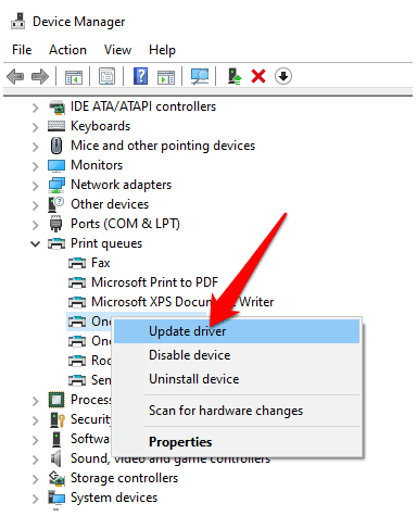 - Haga clic con el botón derecho en el nombre de su impresora(printer’s name) y seleccione Actualizar controlador(Update driver) .