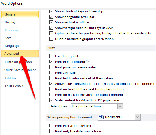 - Desplácese hacia abajo hasta Imprimir(Print ) y desmarque la casilla junto a Imprimir solo los datos de un formulario(Print only the data from a form) . Seleccione Aceptar(OK) e intente imprimir su documento nuevamente.