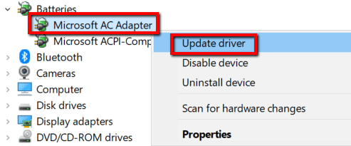 Primero, ve a Adaptador de CA de Microsoft(adaptador de CA de Microsoft) . Haga clic derecho y seleccione Actualizar el controlador(Actualizar los controladores) .