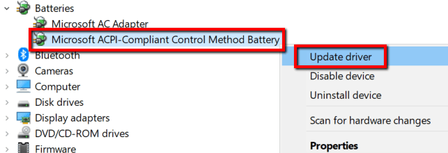 ahora ve a Batería de método de control compatible con ACPI de Microsoft(Batería para método de control compatible con Microsoft ACPI) . Haga clic derecho sobre él y también seleccione Actualizar el controlador(Actualizar los controladores) .