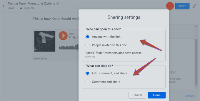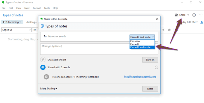 Ambos servicios tienen formas similares de compartir. Paper usa un botón Invitar(Invite ) mientras que Evernote tiene un botón Compartir(Share ) . Ambos permiten el control de permisos sobre quién puede editar y ver.