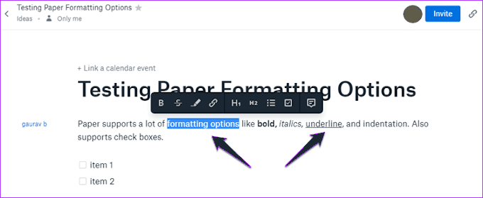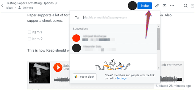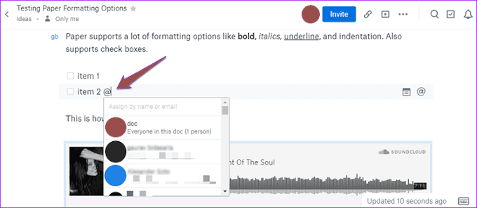 Cuando se trata de colaboración, Paper brilla más. Te permite llamar la atención de una nota en particular a través de una @mención. A continuación, puede crear listas de tareas pendientes y asignar tareas individuales a los diferentes miembros de su equipo.