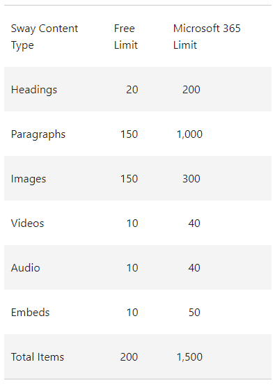 Los usuarios de Microsoft 365(Microsoft 365) disfrutan de límites más altos en la cantidad de elementos de Sway que pueden usar en cada Sway que crean.