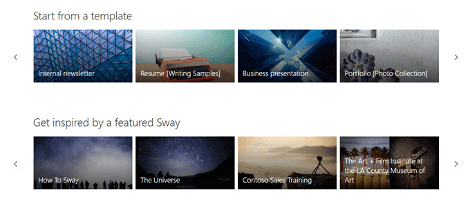 Un buen primer paso es revisar las plantillas que proporciona Sway o » Inspírese con un (Get)Sway destacado » y vea algunos ejemplos excelentes de lo que puede hacer con la aplicación. Como alternativa, puede buscar un tema y Sway creará un esquema para que lo siga. ¿(Don) No le gustaría que PowerPoint hiciera eso por usted?