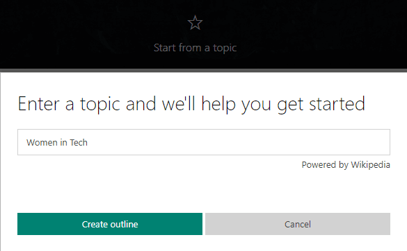 En este caso, buscaremos un tema y seleccionaremos el botón Crear esquema(Create outline) . Sway creará el marco de su presentación para usted.