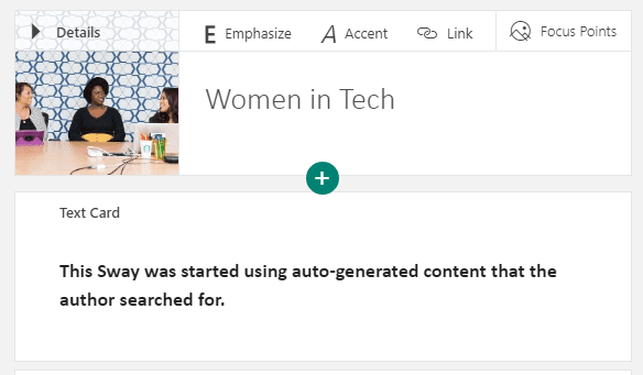 Sway ha asignado automáticamente a Sway un título y tarjetas de contenido que puede editar en cualquier momento. Elimine(Delete) cualquier tarjeta seleccionando el ícono de la papelera en la tarjeta que desea eliminar.