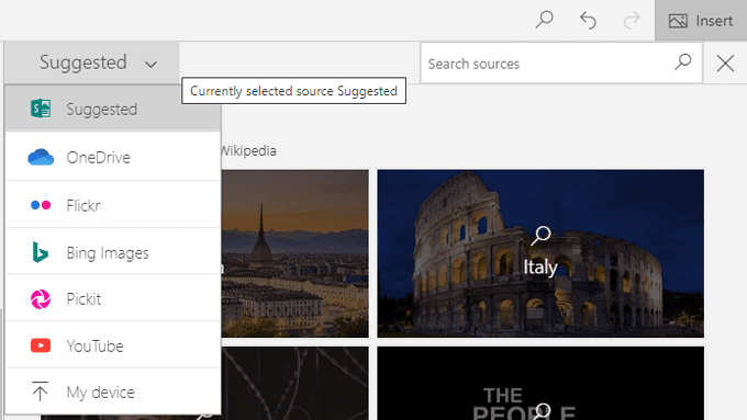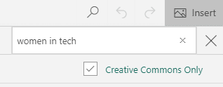 Seleccione una fuente de contenido y luego escriba una palabra o frase en el campo marcado Buscar fuentes(Search sources) . Finalmente, selecciona el ícono de la lupa o presiona Enter . Marque la casilla Creative Commons Only para restringir los resultados al contenido que no requiere una licencia de uso.