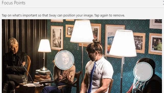 Establecer puntos de enfoque es importante porque ayuda a Sway a elegir cómo colocar la imagen. Seleccione las partes más importantes de la imagen y Sway determinará la mejor posición para la imagen según su dispositivo y el estilo que elija.