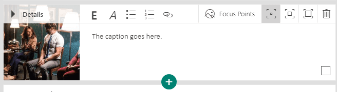 Las tarjetas en el espacio de trabajo de Storyline ofrecen varias opciones según el tipo de contenido que tengan. Las tarjetas de imagen le permiten formatear el texto del título de la imagen, elegir los puntos de enfoque(Focus Points) en su imagen y elegir cuánto desea enfatizar esa tarjeta.